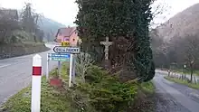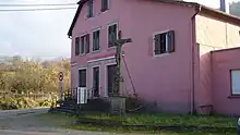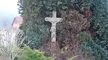 Située à l’ouest de la localité, dans l’angle aigu formé d’une part par la route du village descendant vers Urbeis, d’autre part par la D 155 montant vers le col de Fouchy – 064,83 x 81.25 La croix à crucifix est en grès rose grossier de la vallée. Les bras et le montant supérieur aux extrémités sont chantournées : courbe convexe flanquée de deux courbes concaves. Sur le montant supérieur on distingue une banderole verticale avec l’inscription I.N.R.I.. Le Christ est sculpté maladroitement dans la masse, en haut relief, couronné d’épines, tête rentrée entre les épaules, légèrement penchée vers le côté, bras en V ouvert, pieds superposés, prenant appui sur le crâne d’Adam. Le serpent de la tentation sort de l’orbite droite et se love autour du crâne. La transition vers le fût se fait par un léger épaississement en congé, vers l’avant. Un deuxième élargissement, aux épaulements convexes peu marqués, fait la transition vers la base. Sur celle-ci est gravé en gros décor le trigramme I.H.S. (Jesus Hominum Salvador). Les lettres I. et S. reposent sur les bras verticaux du H qui sont reliés entre eux à leur sommet par une sorte de pont supportant une croix en tau.