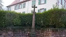 Cette croix est située au centre de la localité, dans un renfoncement du mur clôturant le jardin du presbytère, en bordure de la rue principale – 065.67 x 81.59 Crucifix en grès rose, sculpté par G. Henrichs de Sélestat / Bras droits. Écriteau INRI sur montant supérieur. Christ sculpté dans la masse, couronné d’épines, bras à l’horizontale, pieds cloués côte à cote. Élargissement de la hampe vers le bas après un ressaut – Fût quadrangulaire élancé, au sommet à trois séries de moulures se terminant en tailloir, s’élargissant régulièrement vers le bas jusqu’à un étranglement pris entre deux moulures saillantes, se terminant en dessous en cube. Base cubique, aux arêtes supérieures soulignées par une rainure, se raccordant à la base du fût par une pente en doucine.