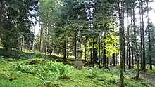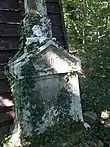 Située dans la montagne, en pleine forêt, à l’endroit appelé le « Bois des Cloches » au flanc du vallon du Rouhu, à 675 mètres d’altitude - 963.33 x 80.22 Accès : au Col de Norceux que l’on atteint par le chemin des Allemands, suivre le « Circuit du Rouhu », bien balisé par le Club vosgien de Villé, par un disque bleu, pendant une vingtaine de minutes. En arrivant à la limite d’une haute futaie, quitter le circuit et s’engager à droite dans le chemin en descende, sur environ 500 mètres. La croix se trouve dans le premier chemin à droite, entre deux sapins, à 10 mètres. Lorsqu’on revient sur le « circuit du Rouhu », il est possible de le contourner en passant par le Col de Schlingoutte où se trouve la croix no 3 de Fouchy. L’itinéraire décrit ci-dessus ne peut être effectué qu’à pied. Magnifique promenade avec de belles vues. On peut aussi arriver en voiture tout près de la croix en empruntant le nouveau chemin forestier qui prend son départ sur la route d’Urbeis, à l’entrée du vallon du Rouhu. Croix à crucifix, en grès gris, sculptée par Ch. Henrichs de Sélestat, sauf le Christ qui est en porcelaine peinte en argent. Extrémités de la traverse et sommet de la hampe se terminant en pointe d’angle obtus après un ressaut en congé ; Christ tête penchée vers le côté, couronné d’épines, bras en V ouvert ; pied superposés. Le bas de la hampe, après un élargissement en congé, repose sur une petite base cubique mouluré en haut et en bas. Piédestal quadrangulaire, plus haut que large, se raccordant par sa surface supérieure à la base de la croix par des plans inclinés vers l’avant et les deux côtés. Socle sculpté en grès rose, représentant deux assisses de pierres grossièrement taillées. Hauteur totale : 3.45 – Croix : 2.00 x 1.05 – base de la croix : 0.34 x 0.27 x 0.23 – piédestal : 1.25 x 0.60 x 0.33 - socle : 0.20 x 0.85 x 0.60 Croix en bon état, sauf écriteau INRI manquant (trou de scellement visible). Entouré d’un grillage en fer forgé. Inscriptions : sur la face avant du piédestal : O mon Jésus/ protégez-nous ; et sur le côté droit du piédestal : érigé par les familles / J.B. Entzmann / Fr. Deybre / 1924