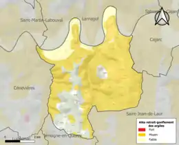 Le retrait-gonflement des sols argileux est susceptible d'engendrer des dommages importants aux bâtiments en cas d’alternance de périodes de sécheresse et de pluie. 71,2 % de la superficie communale est en aléa moyen ou fort (67,7 % au niveau départemental et 48,5 % au niveau national). Sur les 207 bâtiments dénombrés sur la commune en 2019, 151 sont en aléa moyen ou fort, soit 73 %, à comparer aux 72 % au niveau départemental et 54 % au niveau national. Une cartographie de l'exposition du territoire national au retrait gonflement des sols argileux est disponible sur le site du BRGM[31],[Carte 2].