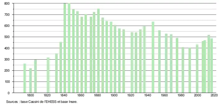 L'évolution du nombre d'habitants est connue à travers les recensements de la population effectués dans la commune depuis 1793. Pour les communes de moins de 10 000 habitants, une enquête de recensement portant sur toute la population est réalisée tous les cinq ans, les populations légales des années intermédiaires étant quant à elles estimées par interpolation ou extrapolation[5]. Pour la commune, le premier recensement exhaustif entrant dans le cadre du nouveau dispositif a été réalisé en 2008[6].
