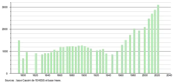 L'évolution du nombre d'habitants est connue à travers les recensements de la population effectués dans la commune depuis 1793. Pour les communes de moins de 10 000 habitants, une enquête de recensement portant sur toute la population est réalisée tous les cinq ans, les populations légales des années intermédiaires étant quant à elles estimées par interpolation ou extrapolation[29]. Pour la commune, le premier recensement exhaustif entrant dans le cadre du nouveau dispositif a été réalisé en 2006[30].