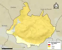 Le retrait-gonflement des sols argileux est susceptible d'engendrer des dommages importants aux bâtiments en cas d’alternance de périodes de sécheresse et de pluie. 88 % de la superficie communale est en aléa moyen ou fort (67,7 % au niveau départemental et 48,5 % au niveau national). Sur les 158 bâtiments dénombrés sur la commune en 2019, 157 sont en aléa moyen ou fort, soit 99 %, à comparer aux 72 % au niveau départemental et 54 % au niveau national. Une cartographie de l'exposition du territoire national au retrait gonflement des sols argileux est disponible sur le site du BRGM[24],[Carte 2].