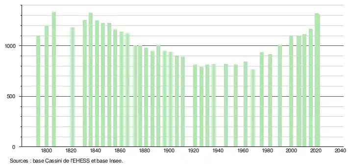 L'évolution du nombre d'habitants est connue à travers les recensements de la population effectués dans la commune depuis 1793. Pour les communes de moins de 10 000 habitants, une enquête de recensement portant sur toute la population est réalisée tous les cinq ans, les populations légales des années intermédiaires étant quant à elles estimées par interpolation ou extrapolation[24]. Pour la commune, le premier recensement exhaustif entrant dans le cadre du nouveau dispositif a été réalisé en 2005[25].