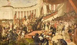 - Fête patriotique du cinquantenaire de l'indépendance belge, le , huile sur toile, 250 × 430 cm[1], 1890, Chambre des Représentants, Palais de la Nation, Bruxelles.