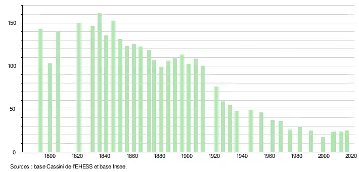 | L'évolution du nombre d'habitants est connue à travers les recensements de la population effectués dans la commune depuis 1793. Pour les communes de moins de 10 000 habitants, une enquête de recensement portant sur toute la population est réalisée tous les cinq ans, les populations légales des années intermédiaires étant quant à elles estimées par interpolation ou extrapolation[7]. Pour la commune, le premier recensement exhaustif entrant dans le cadre du nouveau dispositif a été réalisé en 2007[8]. En 2016, la commune comptait 25 habitants[Note 1], en diminution de 3,85 % par rapport à 2010 (Hautes-Pyrénées : +1,04 %, France hors Mayotte : +1,84 %). |