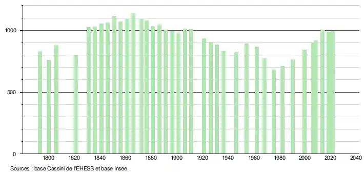| L'évolution du nombre d'habitants est connue à travers les recensements de la population effectués dans la commune depuis 1793. Pour les communes de moins de 10 000 habitants, une enquête de recensement portant sur toute la population est réalisée tous les cinq ans, les populations légales des années intermédiaires étant quant à elles estimées par interpolation ou extrapolation[26]. Pour la commune, le premier recensement exhaustif entrant dans le cadre du nouveau dispositif a été réalisé en 2008[27]. En 2021, la commune comptait 989 habitants[Note 3], en diminution de 3,23 % par rapport à 2015 (Landes : +4,9 %, France hors Mayotte : +1,84 %). |