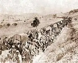 L'entrée en guerre du royaume de Bulgarie aux côtés des Empires centraux, le 7 octobre 1915, scelle le sort de la Serbie : attaquée au nord par une armée conjointe austro-allemande et à l'est par les Bulgares, l'armée serbe est défaite et mise en déroute vers la région du Kosovo ; le débarquement des forces anglo-françaises à Thessalonique ne profite pas à la Serbie, car les troupes bulgares occupent rapidement la Macédoine, empêchant les alliés de se rejoindre[8]. Le 28 novembre 1915, le commandant en chef serbe, le général Radomir Putnik, ordonne une retraite générale du Kosovo vers le Nord de l'Albanie et la côte de la mer Adriatique, d'où les Serbes espèrent obtenir une aide des forces navales alliées : au milieu de l'hiver, sous de fortes chutes de neige et avec de maigres provisions, les forces serbes ont dû traverser la difficile région montagneuse de Prokletije, perdant des dizaines de milliers d'hommes à cause de la famine, de l'hypothermie et des attaques des irréguliers albanais avant d'atteindre les zones contrôlées par les gendarmes d'Essad Pacha[6].