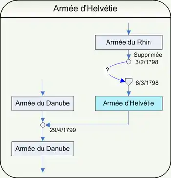 • Par arrêté du (2 floréal an VII), mis en exécution le , elle est supprimée et réunie à l'armée du Danube