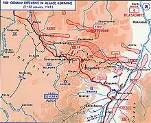 En , la situation change avec le départ de la IIIe armée américaine et la reprise des combats par la VIIe armée américaine. Côté allemand, la Ire armée allemande assure toujours la défense du Reich dans ce secteur du front. La ligne de front se confond maintenant avec la Ligne Siegfried. C'est dans ces conditions qu'eut lieu l'opération Nordwind, du au , dans le nord de la Lorraine et de l'Alsace. L'objectif de l'offensive était double. L'OKW voulait d'une part soulager les troupes allemandes engagées dans la bataille des Ardennes, en mobilisant des forces alliées dans le nord-est de la France. D'autre part, il voulait détruire la 7e armée américaine qui menaçait toujours la ligne Siegfried. Le Groupe d'armées G du général Johannes Blaskowitz attaque avec 4 corps d'armée, le LXXXII. Armeekorps, le XIII. SS-Armeekorps, le LXXXX. Armeekorps et le LXXXIX. Armeekorps[9]. Le Heeresgruppe sera renforcé par le Volks-Artillerie-Korps 410, les 7e et 20e Volks-Werfer-Brigaden, la Schwere Panzerjäger Abteilung 653, la Mörser-Batterie 428 et les Panzer-Flamm-Kompanien 352 et 353[9]. À la fin du mois de janvier, l'offensive, stoppée par les troupes alliées, fut abandonnée. Malgré l'échec de l'offensive, les Américains n'exploitent pas la situation. Ils campent sur leurs positions en Lorraine jusqu'au déclenchement de l'opération Undertone le . La 100e Infantry Division prend Bitche le 16 mars 1945, mettant ainsi un terme à la Campagne de Lorraine[9].