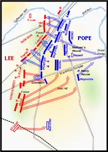 Des éléments en provenance de trois corps de l'Armée du Potomac de McClellan (les III, V et VI corps), ainsi que le IXe corps du major-général Ambrose Burnside, commandé par le major-général Jesse L. Reno), se joignirent tardivement aux forces de Pope, amenant son effectif à 77 000 hommes[4].