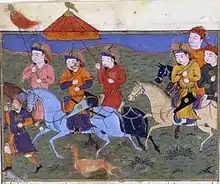 En , Houlagou quitte sa horde (en) en Mongolie et commence sa marche, avec un tümen, à un rythme tranquille et il augmente son nombre d'hommes à sa manière[9],[8],[13]. Il est accompagné de deux de ses dix fils, Abaqa et Yoshmut[12], de son frère Subedei, mort en route[14], de ses épouses Öljei et Yisut et de sa belle-mère Doquz[12],[15].