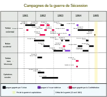 La terminologie consacrée en la matière est celle du Service des parcs nationaux des États-Unis, qui administre les champs de bataille et les monuments liés à la guerre de Sécession, mais des variations peuvent exister, selon les historiens, concernant les combats qui se situent à la charnière de deux théâtres d'opérations ou de deux campagnes. Les engagements isolés, ainsi que certains raids n'entrant pas dans une stratégie identifiable, ne sont pas rattachés à des campagnes[2].
