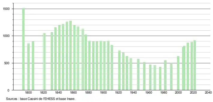 L'évolution du nombre d'habitants est connue à travers les recensements de la population effectués dans la commune depuis 1793. Pour les communes de moins de 10 000 habitants, une enquête de recensement portant sur toute la population est réalisée tous les cinq ans, les populations légales des années intermédiaires étant quant à elles estimées par interpolation ou extrapolation[15]. Pour la commune, le premier recensement exhaustif entrant dans le cadre du nouveau dispositif a été réalisé en 2007[16].
