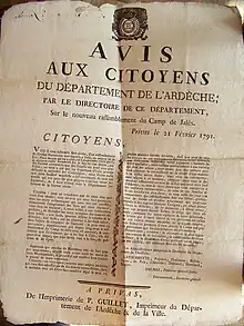 C'est le 11 juillet 1790, au château du comte du Roure à Banne, que les membres des conseils municipaux des communes voisines demandent que l'Assemblée constituante soit chargée d'organiser un rassemblement des gardes nationaux[6].