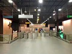 La station a été réalisée par le groupement Casalta - Gorget - Harter (atelier CACTUS). Elle possède de nombreuses galeries de liaison souterraine par rapport aux autres stations de la ligne. L'œuvre d'art qui est présente sur cette station est un ensemble de quatre sculptures monumentales de l'artiste Daniel Pommereulle. Son œuvre utilise les matériaux suivants : verre, cuivre, porcelaine, ardoise, bronze et marbre rouge[3]. Les tranches de verre rappellent l'eau du canal qui se trouve au-dessus de la station.