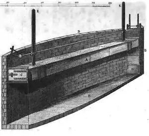 Le cœur du dispositif est un grand volume rempli d’eau, aux parois lisses et verticales, appelé citerne. Un canal arrive à son sommet, sur l’un des petits côtés de la section oblongue. Au fond de la citerne, une porte, située également sur un des petits côtés de la section oblongue, s’ouvre sur autre canal.