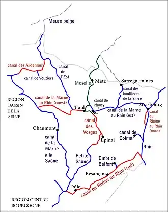 - Nancy avec connexion au canal de l'Est par le Canal de jonction de Nancy.