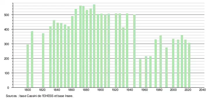 L'évolution du nombre d'habitants est connue à travers les recensements de la population effectués dans la commune depuis 1800. Pour les communes de moins de 10 000 habitants, une enquête de recensement portant sur toute la population est réalisée tous les cinq ans, les populations légales des années intermédiaires étant quant à elles estimées par interpolation ou extrapolation[10]. Pour la commune, le premier recensement exhaustif entrant dans le cadre du nouveau dispositif a été réalisé en 2006[11].
