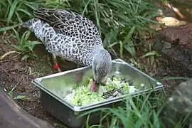 Anas capensis se nourrit de plantes aquatiques, insectes, crustacés et têtards, amphibiens[1].