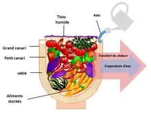 Un pot en terre cuite poreuse, canari en Afrique de l'Ouest et centrale, garni de sable humide, contient un pot intérieur dans lequel l'aliment est placé ; si le pot intérieur est hermétique, il peut contenir des liquides[10] : l'évaporation du liquide extrait la chaleur de la cuve intérieure transférant son enthalpie de vaporisation à l'air ambiant. L'appareil peut être utilisé pour refroidir des substances telles que l'eau, les aliments ou les médicaments sensibles aux hautes températures.