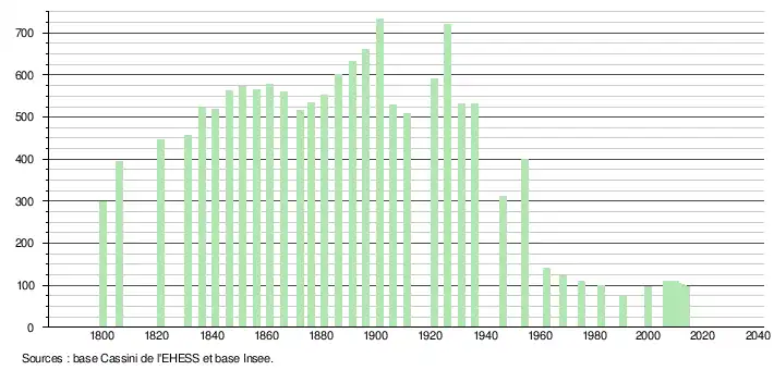 L'évolution du nombre d'habitants est connue à travers les recensements de la population effectués dans la commune depuis 1800. Pour les communes de moins de 10 000 habitants, une enquête de recensement portant sur toute la population est réalisée tous les cinq ans, les populations légales des années intermédiaires étant quant à elles estimées par interpolation ou extrapolation[6]. Pour la commune, le premier recensement exhaustif entrant dans le cadre du nouveau dispositif a été réalisé en 2007[7].