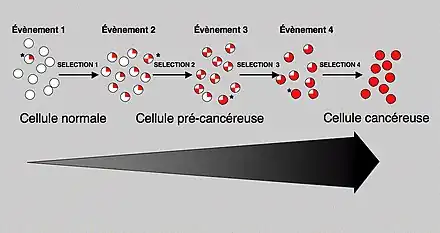 Contrairement aux maladies génétiques comme la mucoviscidose, les myopathies ou certaines hémophilies qui sont des maladies monogéniques (un seul gène est généralement altéré), le cancer est une maladie multigénique[20]. Chaque cancer a pour origine l'altération de 10 à 20 gènes. Ces altérations se produisent de manière successive, chacune d'entre elles favorisant la suivante (voir encadré). Cette suite d'altérations se produit généralement sur une très longue plage chronologique (5 à 20 ans) ; elle n'est pas aléatoire et pour chaque type de cancer, on a pu mettre en évidence d'une part une certaine spécificité des gènes altérés, et d'autre part une chronologie dans le développement des évènements.