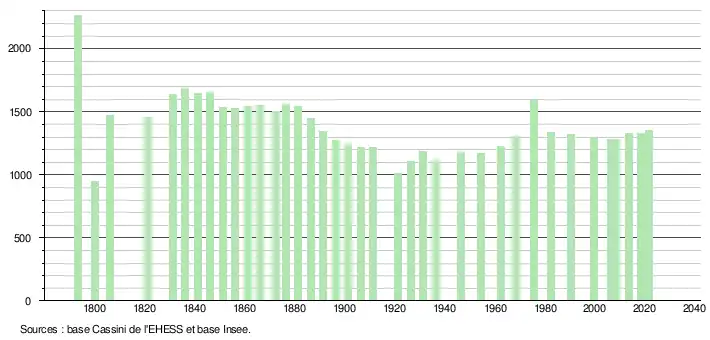 L'évolution du nombre d'habitants est connue à travers les recensements de la population effectués dans la commune depuis 1793. Pour les communes de moins de 10 000 habitants, une enquête de recensement portant sur toute la population est réalisée tous les cinq ans, les populations légales des années intermédiaires étant quant à elles estimées par interpolation ou extrapolation[25]. Pour la commune, le premier recensement exhaustif entrant dans le cadre du nouveau dispositif a été réalisé en 2008[26].