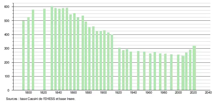 L'évolution du nombre d'habitants est connue à travers les recensements de la population effectués dans la commune depuis 1793. Pour les communes de moins de 10 000 habitants, une enquête de recensement portant sur toute la population est réalisée tous les cinq ans, les populations légales des années intermédiaires étant quant à elles estimées par interpolation ou extrapolation[22]. Pour la commune, le premier recensement exhaustif entrant dans le cadre du nouveau dispositif a été réalisé en 2005[23].