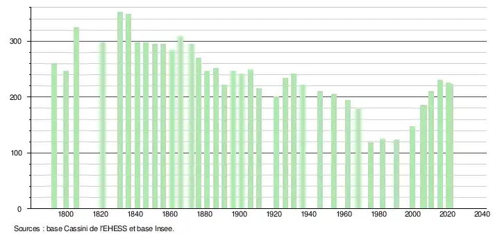 L'évolution du nombre d'habitants est connue à travers les recensements de la population effectués dans la commune depuis 1793. Pour les communes de moins de 10 000 habitants, une enquête de recensement portant sur toute la population est réalisée tous les cinq ans, les populations légales des années intermédiaires étant quant à elles estimées par interpolation ou extrapolation[28]. Pour la commune, le premier recensement exhaustif entrant dans le cadre du nouveau dispositif a été réalisé en 2005[29].