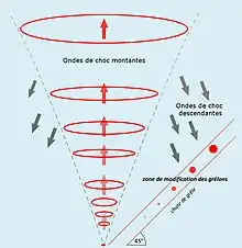 - Fragmentation des embryons de grêle et donc multiplication des noyaux de congélation. Ceci a pour effet d'empêcher les grêlons de grossir et d'atteindre, pendant leur chute, une inertie trop importante qui pourrait les rendre dangereux (ce principe est le même que pour les ensemencements de nuage à iodure d'argent mais serait obtenu par onde de choc).