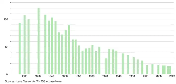 L'évolution du nombre d'habitants est connue à travers les recensements de la population effectués dans la commune depuis 1793. Pour les communes de moins de 10 000 habitants, une enquête de recensement portant sur toute la population est réalisée tous les cinq ans, les populations légales des années intermédiaires étant quant à elles estimées par interpolation ou extrapolation[20]. Pour la commune, le premier recensement exhaustif entrant dans le cadre du nouveau dispositif a été réalisé en 2008[21].
