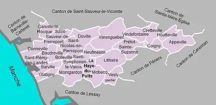 À la suite du redécoupage des cantons pour 2015, les communes d'Appeville, Cretteville, Houtteville et Vindefontaine sont rattachées au canton de Carentan et les communes de Baudreville, Bolleville, Canville-la-Rocque, Coigny, Denneville, Doville, Glatigny, La Haye-du-Puits, Lithaire, Mobecq, Montgardon, Neufmesnil, Prétot-Sainte-Suzanne, Saint-Nicolas-de-Pierrepont, Saint-Rémy-des-Landes, Saint-Sauveur-de-Pierrepont, Saint-Symphorien-le-Valois, Surville, Varenguebec et Vesly à celui de Créances.