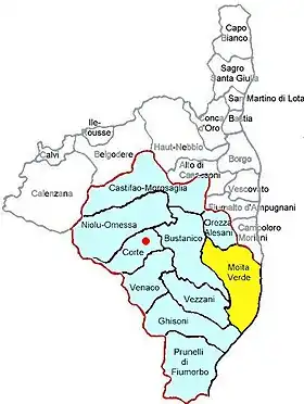 Localisation du canton de Moita-Verde avant 2015 (en jaune), dans l'arrondissement de Corte (en bleu).