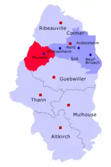 Représentation du canton de Munster au sein de l'arrondissement de Colmar et du département du Haut-Rhin.