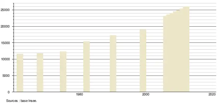 - Population municipale légale en vigueur au 1er janvier 2024, millésimée 2021, définie dans les limites territoriales en vigueur au 1er janvier 2023, date de référence statistique : 1er janvier 2021.