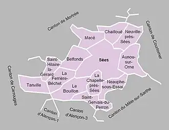 Les anciennes communes suivantes étaient incluses dans le territoire du canton de Sées antérieur à 2015[21] :