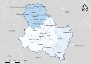 - Aillant-sur-Tholon - Auxerre-Est - Auxerre-Nord - Auxerre-Nord-Ouest - Auxerre-Sud - Auxerre-Sud-Ouest - Bléneau - Brienon-sur-Armançon - Chablis - Charny - Coulanges-la-Vineuse - Coulanges-sur-Yonne - Courson-les-Carrières - Joigny - Ligny-le-Châtel - Migennes - Saint-Fargeau - Saint-Florentin - Saint-Sauveur-en-Puisaye - Seignelay - Toucy - Vermenton