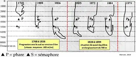 L'observation de l'évolution de la flèche sableuse au cours des derniers 250 ans montre une progression durant environ 60 ans (1768-1826) puis une stabilité relative durant environ 70 ans (1826-1894). De 1894 à 1964, la flèche s'est allongée de 70 m alors que la rive interne s'est érodée et, depuis 1973, on observe un recul constant de la flèche vers le nord du fait de l'érosion qui continue[2]. Sur le versant atlantique, au début du XXIe siècle, le trait de côte recule entre trois et quatre mètres par an[3].