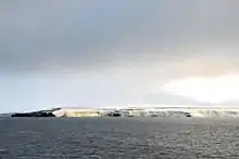 Le cap Fligely, au nord de l'île Prince Rudolf (en rouge) sur la Terre François-Joseph. À gauche l'archipel norvégien du Svalbard et en bas, le nord de la péninsule scandinave avec le cap Nord, la côte arctique russe et la longue île de Nouvelle-Zemble. | |||||