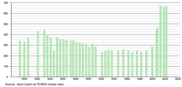 - Population municipale légale en vigueur au 1er janvier 2024, millésimée 2021, définie dans les limites territoriales en vigueur au 1er janvier 2023, date de référence statistique : 1er janvier 2021.