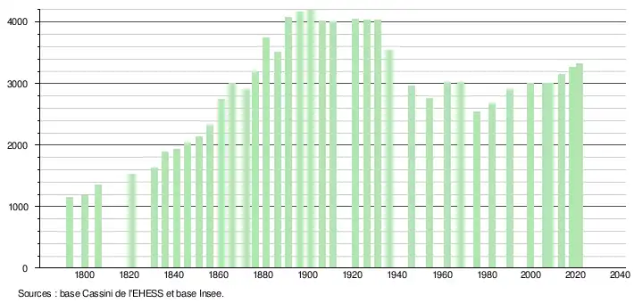 - Population municipale légale en vigueur au 1er janvier 2024, millésimée 2021, définie dans les limites territoriales en vigueur au 1er janvier 2023, date de référence statistique : 1er janvier 2021.