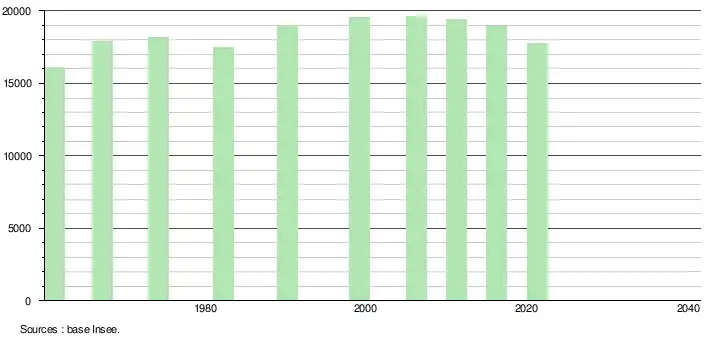 - Par convention dans Wikipédia, le principe a été retenu de n’afficher dans le tableau des recensements et le graphique, pour les populations légales postérieures à 1999, que les populations correspondant à une enquête exhaustive de recensement pour les communes de moins de 10 000 habitants, et que les populations des années 2006, 2011, 2016, etc. pour les communes de plus de 10 000 habitants, ainsi que la dernière population légale publiée par l’Insee pour l'ensemble des communes.