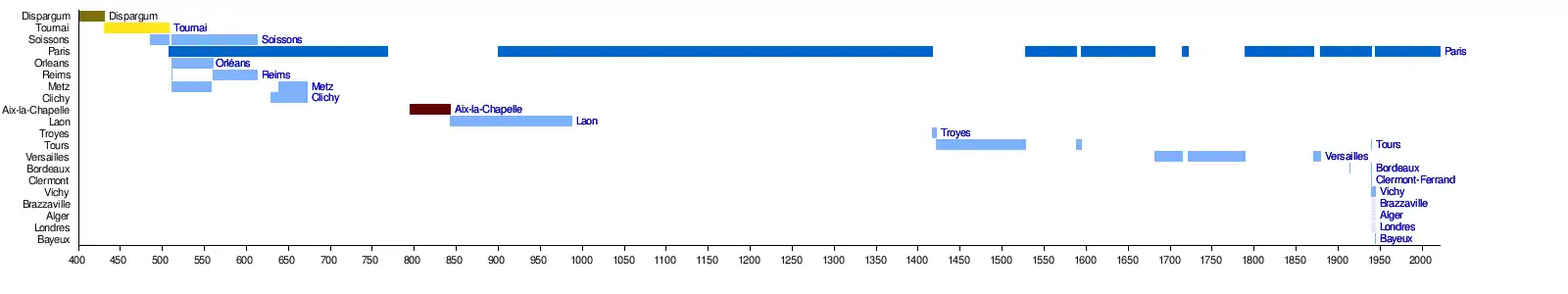 | 508 - 768 | Paris | En 508, Clovis fait de Paris sa capitale. Il réside probablement au palais des Thermes aménagé dans les anciens bains publics romains. Il y décède en 511. Par la suite et malgré les fréquentes divisions du domaine mérovingien, Paris est toujours considérée comme le siège du royaume bien que le roi n'y séjourne pas forcément. |