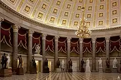 Le Capitole abrite enfin une collection de statues dans le Hall of Columns. Cette galerie longue de 30 mètres[32] est située au premier étage de l'aile des représentants. Son nom vient des 28 colonnes en marbre blanc qui soutiennent un plafond en fonte[32]. Construite au milieu du XIXe siècle par Thomas U. Walter, la pièce abrite la National Statuary Hall Collection décidée par une loi de 1864[33]. Elle comprend deux œuvres données par chacun des 50 États pour honorer des personnages ayant joué un rôle important dans leur histoire. Ainsi, l’État d’Hawaï est représenté par une statue en bronze du roi Kamehameha (1959) et une autre du Père Damien, le symbole de la lutte contre la lèpre. La centième et dernière acquisition de la collection est une statue de Popé, l’Amérindien qui dirigea la révolte des Pueblos contre l’occupation espagnole en 1680. Elle fut donnée par l’État du Nouveau-Mexique le . Un Français y figure, il s'agit de Robert-Joseph Pothier, un célèbre jurisconsulte du XVIIIe siècle.
