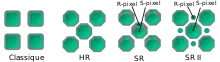 - Puis (Fujifilm, 2004) les photosites sont dédoublés en un élément de grande taille « S » et un élément plus petit « R » qui étend la dynamique vers les hautes lumières (de 2 bits) en deux générations successives, SR et SR II ;