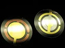 - un résonateur comprenant une électrode en peignes inter-digités (émetteur et récepteur confondus) entourée de réflecteurs métalliques en court-circuit ou en circuit ouvert. La mesure du champ magnétique avec un tel capteur s'effectue en réflexion. Dans cette configuration, la fréquence de résonance varie en fonction du champ magnétique environnant le capteur. La sensibilité d'un tel capteur est principalement dépendante du facteur de qualité du résonateur (celui-ci dépendant du design du résonateur, du matériau des électrodes, du substrat piézoélectrique utilisé, de la polarisation de l'onde acoustique de surface[13]...). Plus précisément, la figure de mérite pertinente est le produit facteur de qualité-fréquence. Typiquement, celui-ci est de l'ordre de 1013 pour le plus sensible des capteurs (104 à1 GHz).