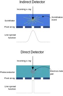 - les capteurs à conversion indirecte : les rayons X sont transformés en lumière par un matériau scintillateur, lumière qui est à son tour transformée en signal électrique par une matrice de détecteurs en silicium amorphe.
