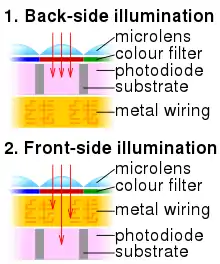 Un capteur rétroéclairé contient les mêmes éléments, mais positionne le câblage derrière la couche de photocathodes en retournant la plaquette de silicium pendant la fabrication, puis en amincissant son envers afin que la lumière puisse frapper la couche de photocathodes sans traverser la couche de câblage[7]. Ce changement augmente la probabilité qu'un photon incident soit capturé, passant d'environ 60 % à plus de 90 %[8] (c’est-à-dire un demi-stop plus rapide), la plus grande différence étant obtenue lorsque la taille des pixels est petite, car la zone de capture de la lumière gagnée en déplaçant le câblage de la surface supérieure (lumière incidente) vers la surface inférieure (paraphrasant la conception BSI) est proportionnellement plus grande pour un pixel plus petit. Les capteurs CMOS BSI sont les plus avantageux en cas de soleil partiel et dans d'autres conditions de faible luminosité[9]. Placer le câblage derrière les capteurs de lumière est similaire à la différence entre un œil de céphalopode et un œil de vertébré. Le positionnement des transistors à matrice active derrière la couche de photocathodes peut entraîner de nombreux problèmes, tels que la diaphonie, qui provoque un bruit numérique, un courant d'obscurité et un mélange de couleurs entre les pixels adjacents. L'amincissement rend également la plaquette de silicium plus fragile. Ces problèmes pourraient être résolus par l'amélioration des procédés de fabrication, mais seulement au prix d'une baisse des rendements et, par conséquent, d'une hausse des prix. Malgré ces problèmes, les premiers capteurs BI ont trouvé des utilisations dans des rôles de niche où leurs meilleures performances en basse lumière étaient importantes. Les premières utilisations comprenaient des capteurs industriels, des caméras de surveillance, des caméras de microscope et des systèmes d’astronomie[8].