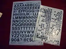 Les caractères transfert sont des polices de caractères imprimés par planches de différents formats, que l'on peut transférer un à un sur le support de son choix, par frottage au moyen d'un stylet, d'un stylo-bille ou de tout outil approprié. Le terme anglais, dry transfer (« transfert à sec »), indique bien qu'il s'agit d'un décalque sans solvant ni eau.